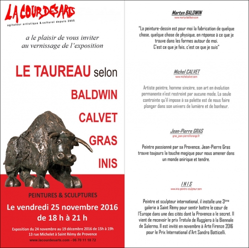 La Cour des Arts a pensé intéressant d'associer à la conférence du Pr F. Saumade sur le « Taureau, animal capital » une exposition d'artistes régionaux autour du taureau. Vous trouverez en pièces jointes une invitation et la présentation de ces deux manifestations :